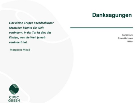 Danksagungen Eine kleine Gruppe nachdenklicher Menschen könnte die Welt verändern. In der Tat ist dies das Konsortium Einzige, was die Welt jemals EntwicklerInnen verändert hat. Bilder Margaret Mead